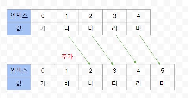 - 특정 인덱스의 객체를 중간부터 추가하면 해당 인덱스부터 마지막 인덱스까지 모두 뒤로 한칸씩 밀려난다.(맨 마지막에 추가할 경우 밀려날 것이 없음)