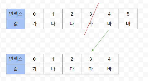 - 특정 인덱스의 객체를 제거하면 바로 뒤 인덱스부터 마지막 인덱스까지 모두 앞으로 한 칸씩 당겨진다.