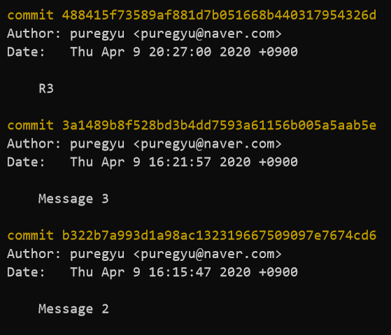 3개의 커밋 내역 git log를 통해 확인한 commit 내역이다. 위 내역에서 커밋 메시지 "R3"를 revert 한다면 해당 커밋의 이전의 커밋으로, 즉 커밋 메시지 "Message 3"의 상태로 되돌아 간다. revert는 코드의 상태가 되돌아가지만 커밋 메시지 "R3"에 대한 내역은 사라지지 않고 새롭게 커밋을 생성하는 개념이다.
